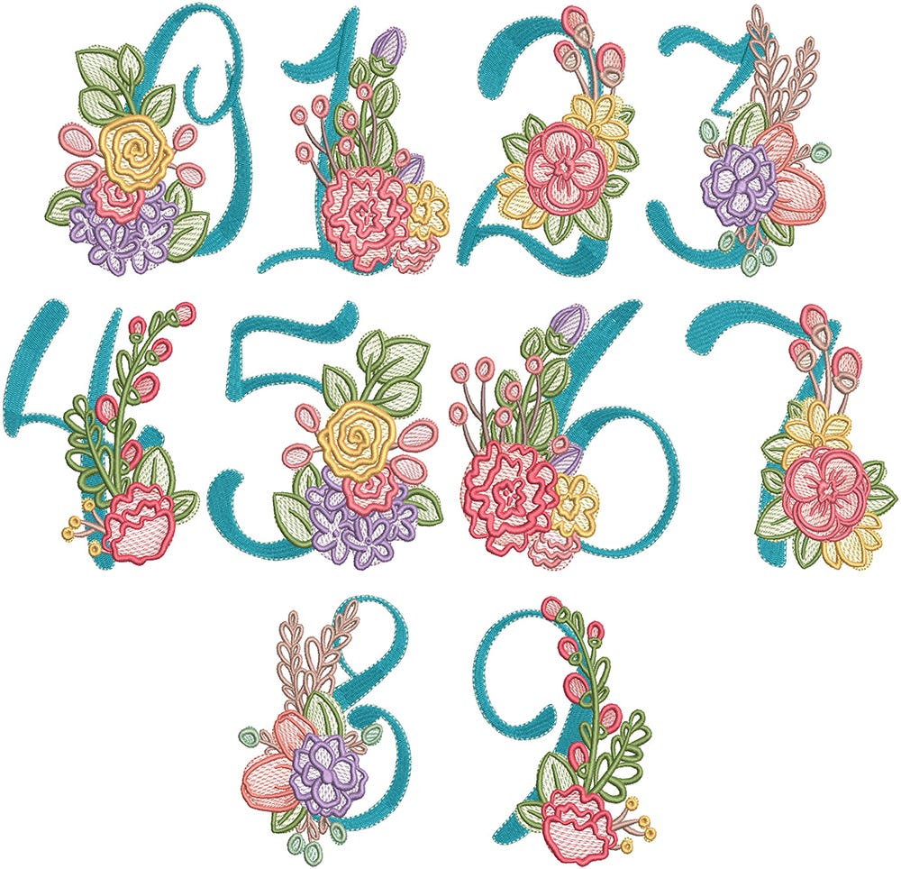 Our Valencia Numbers are embroidery-only with fill stitch numbers and a floral spray. The satin stitch outlines are