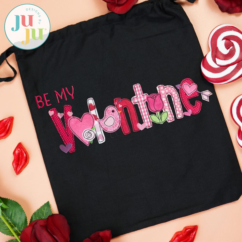 "Be My Valentine" sample shows our Chocolate Chip Embroidery Font and several designs from this set combined with Daisy Doodle Alphabet, not included.