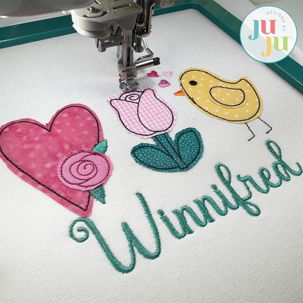 "Winnifred" sample shows our Winnifred Embroidery Font and three designs from this set.