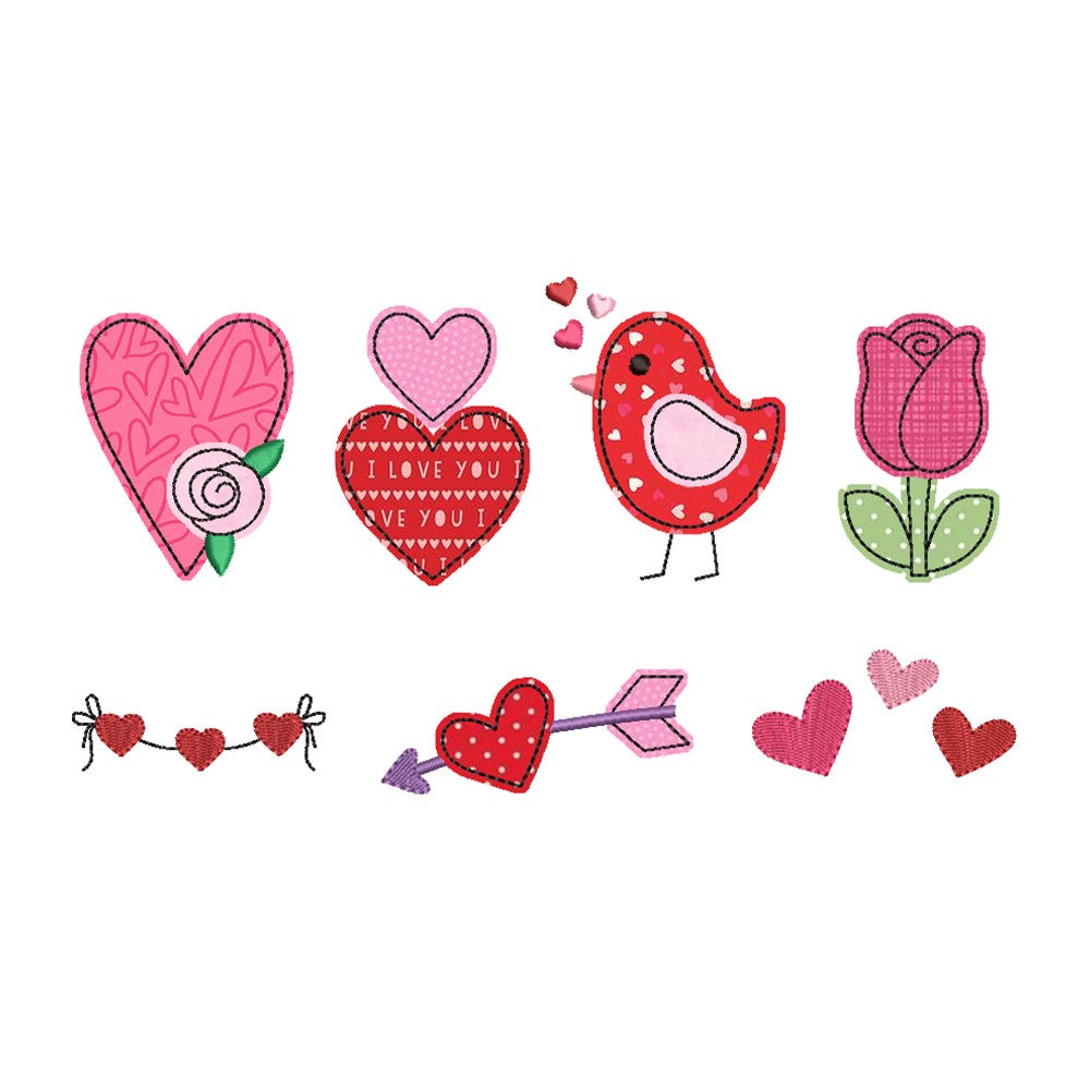 This Valentine Alphabet Embellishment Kit includes 5 appliques (arrow heart, bird, heart flower, rose, two hearts) and 4 embroidery-only accents (heart string, 3 different mini hearts).