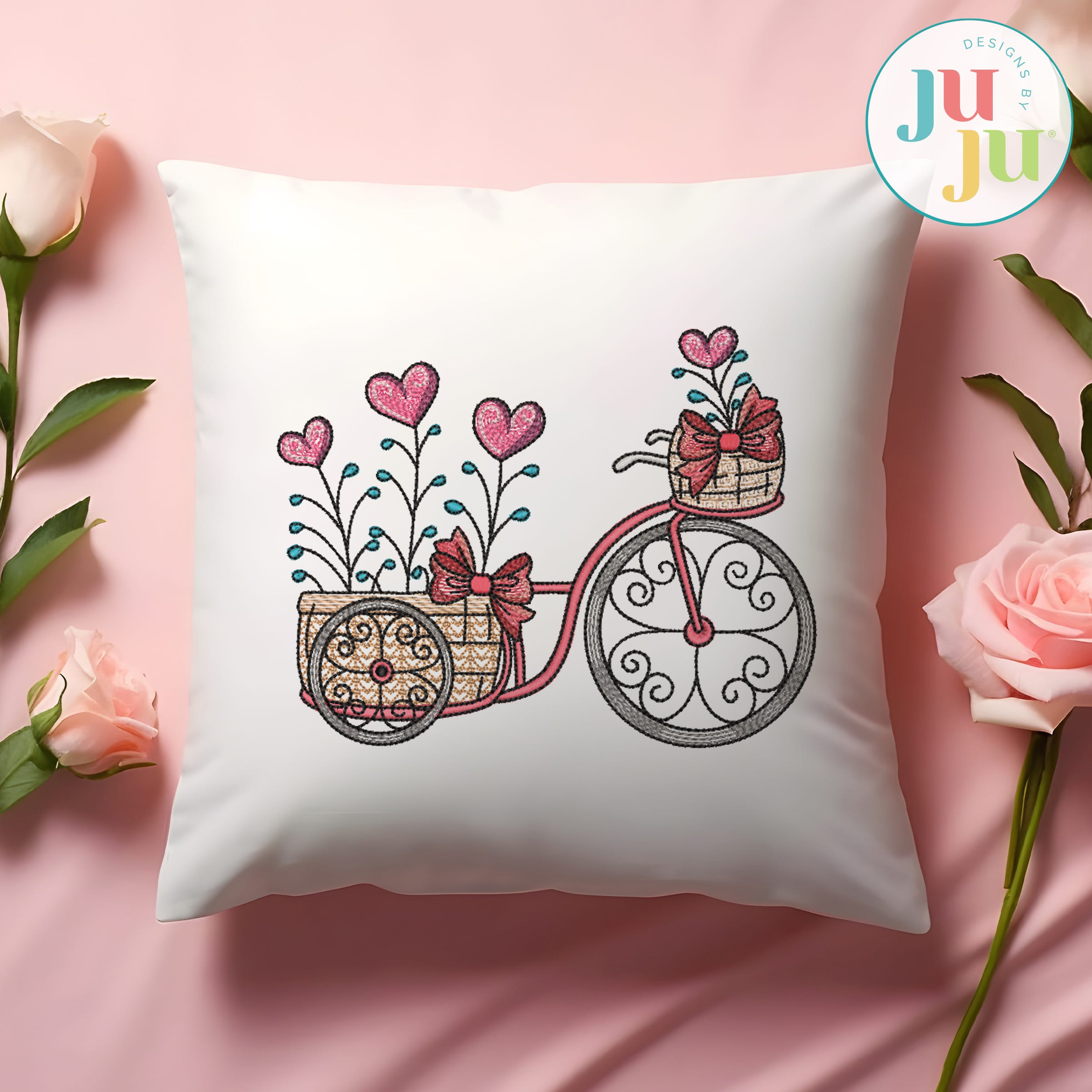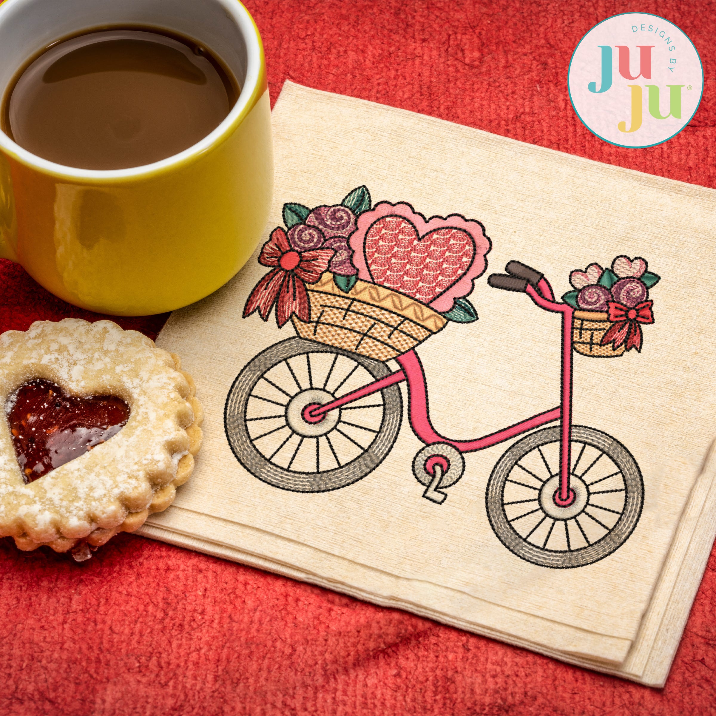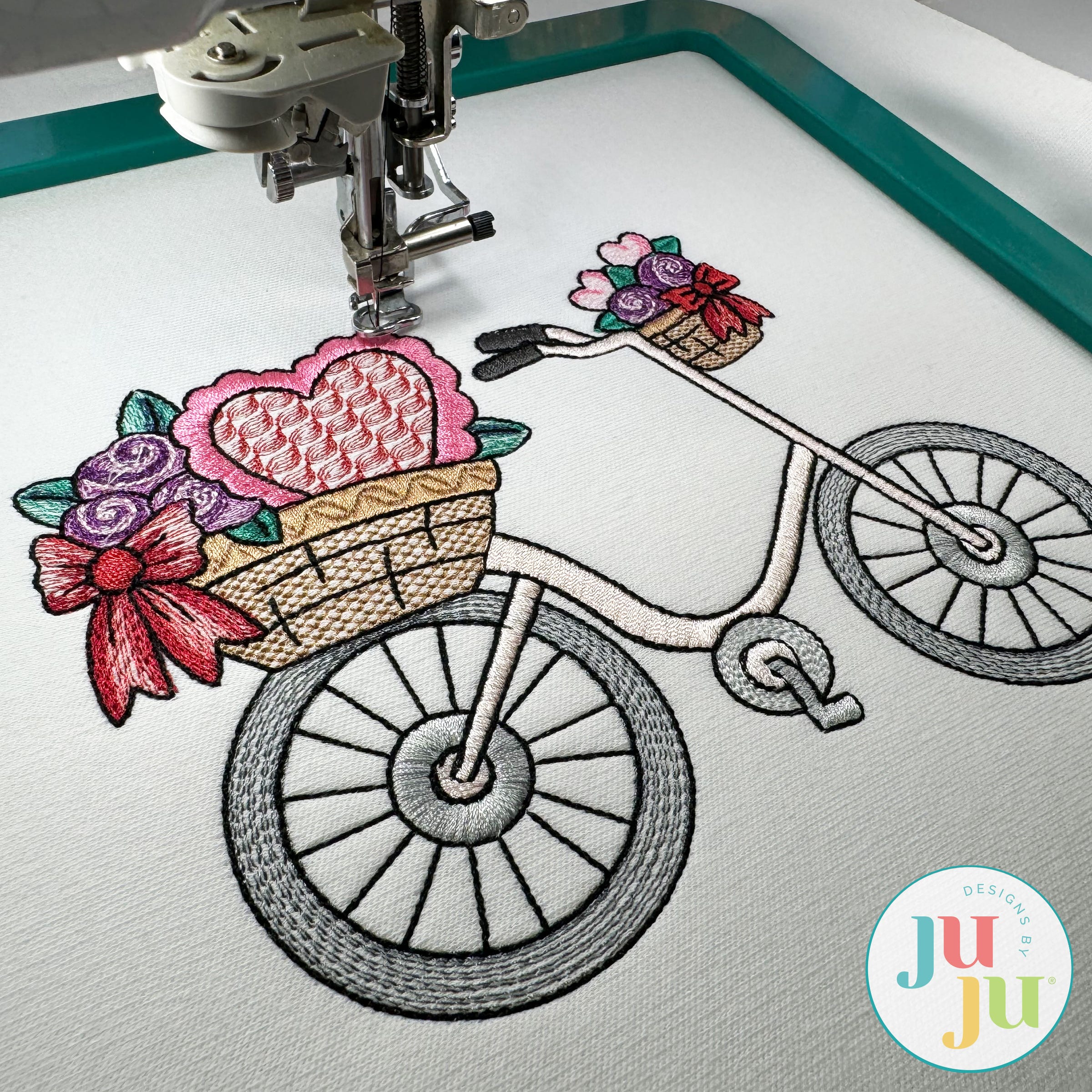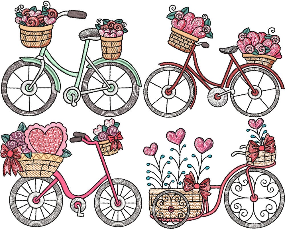 Delivering baskets of love with Valentine bicycles! This set of four embroidery-only designs features multiple color layers of lighter density fill to create a blended, variegated, textured look. Three sizes included (5x7, 6x10 and 8x8). Please note: a 4x4 size is NOT included.