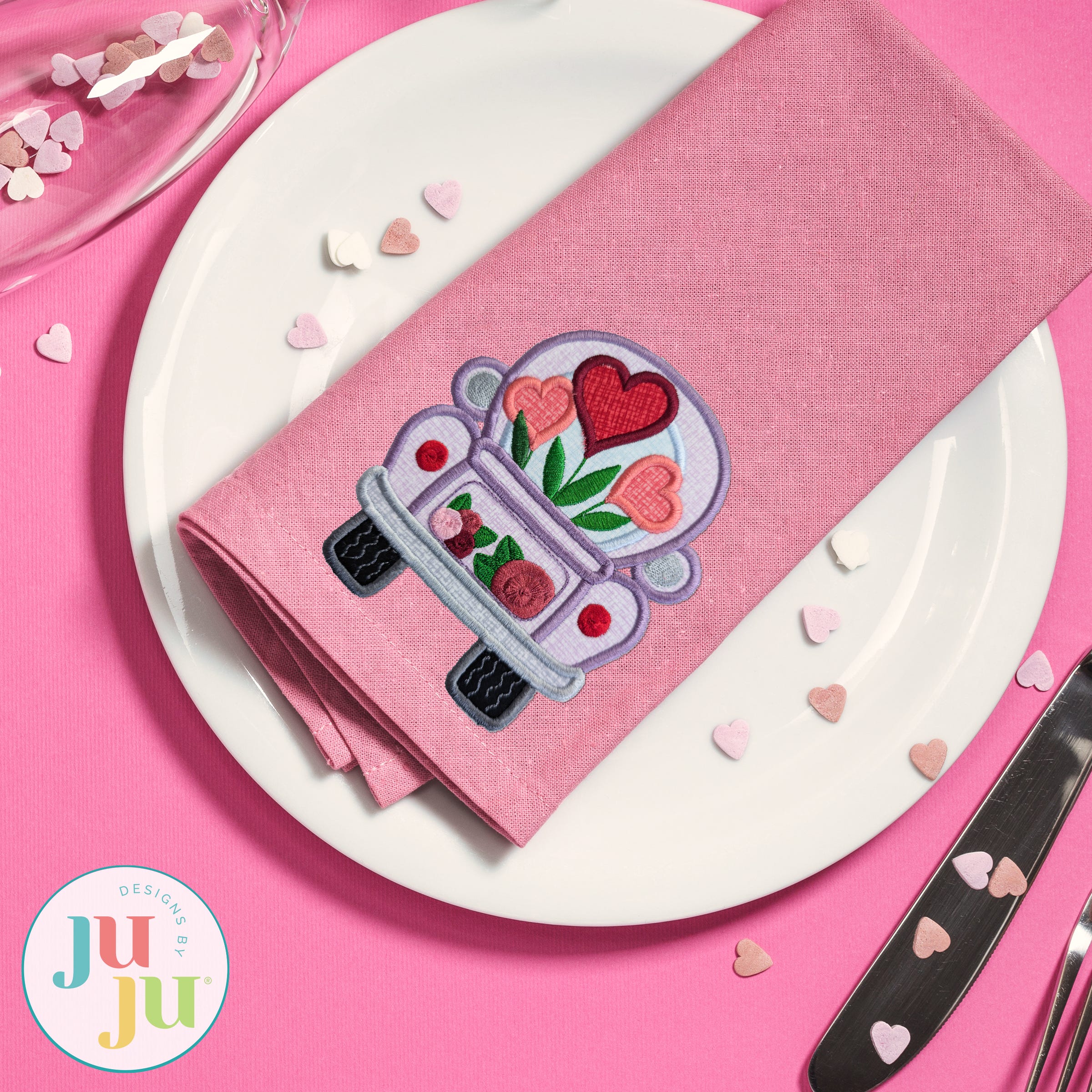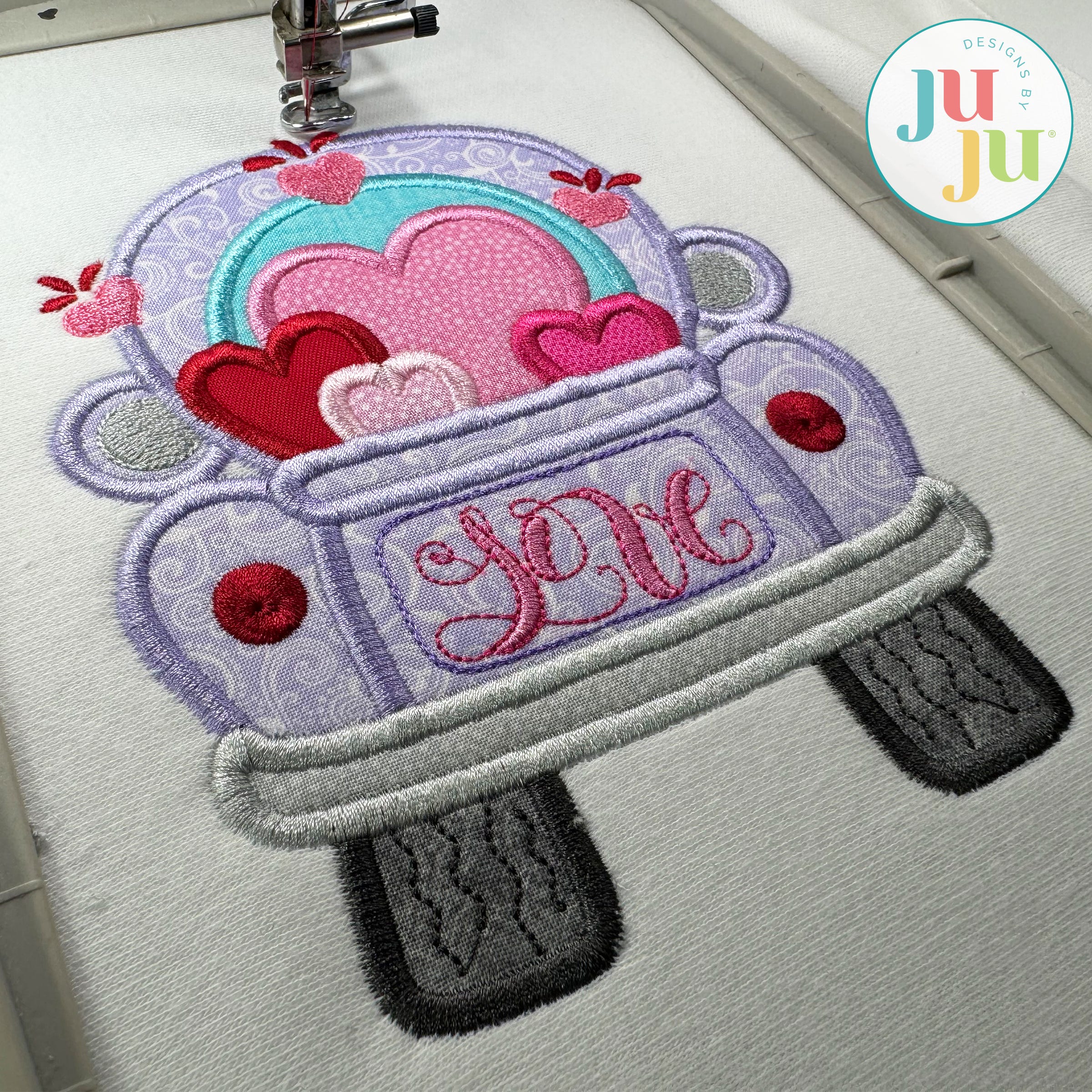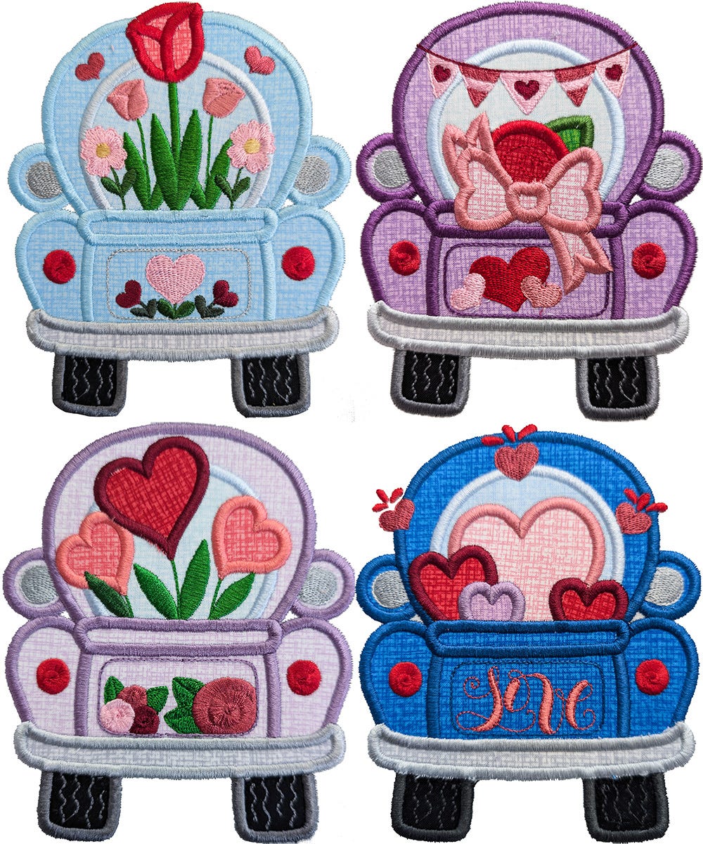 Everything you need for Valentine's Day is out for delivery! These four satin stitch applique trucks are loaded for the holidays with hearts and flowers! Four sizes included (4x4, 5x7, 6x10 and 8x8).