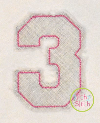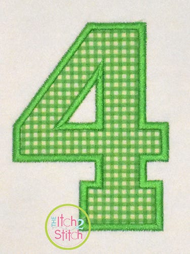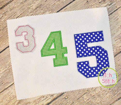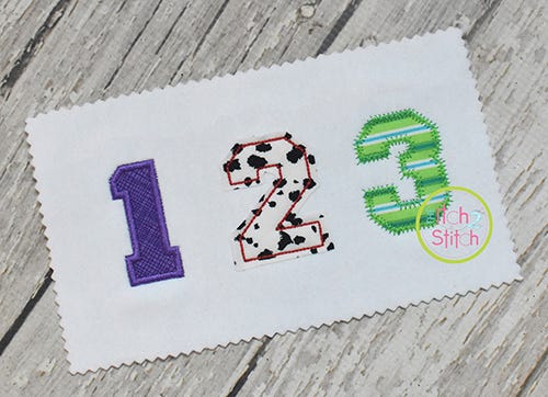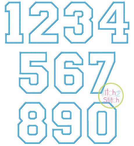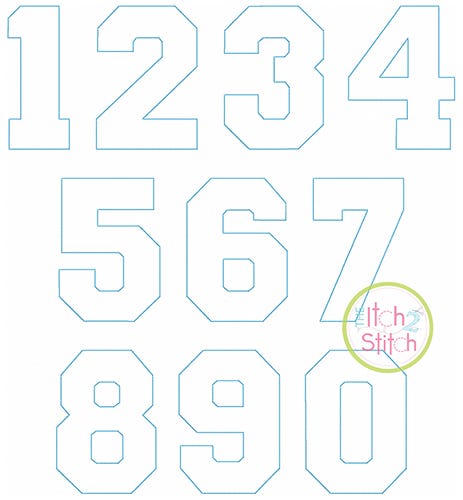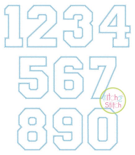 You will receive numbers 0-9 (10 files) in six sizes. Satin Stitch, Zig Zag and Bean Stitch applique versions included. All numbers from the 2", 3" and 4" sizes fit in a 4x4 hoop. Larger sizes require a larger hoop.