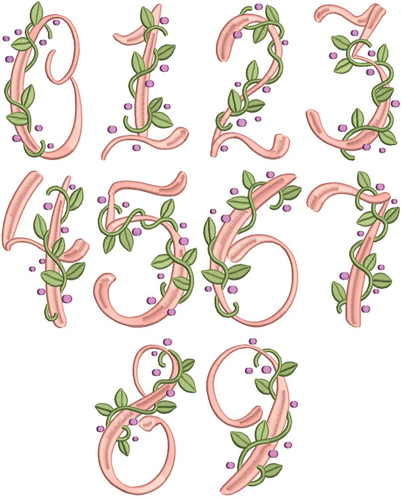 Our Vineyard Vine Numbers feature split-satin stitch numbers with satin stitch vines and berries.