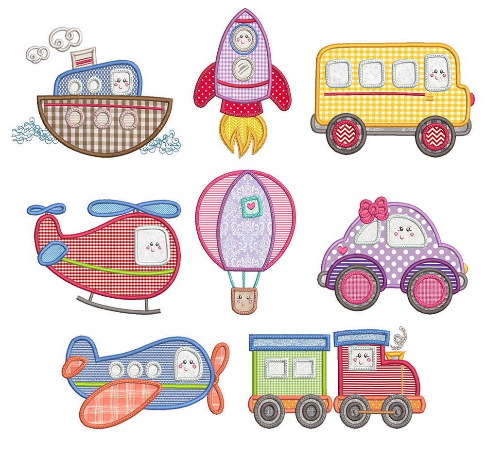 Vroom! 8 super cute modes of transportation in applique!