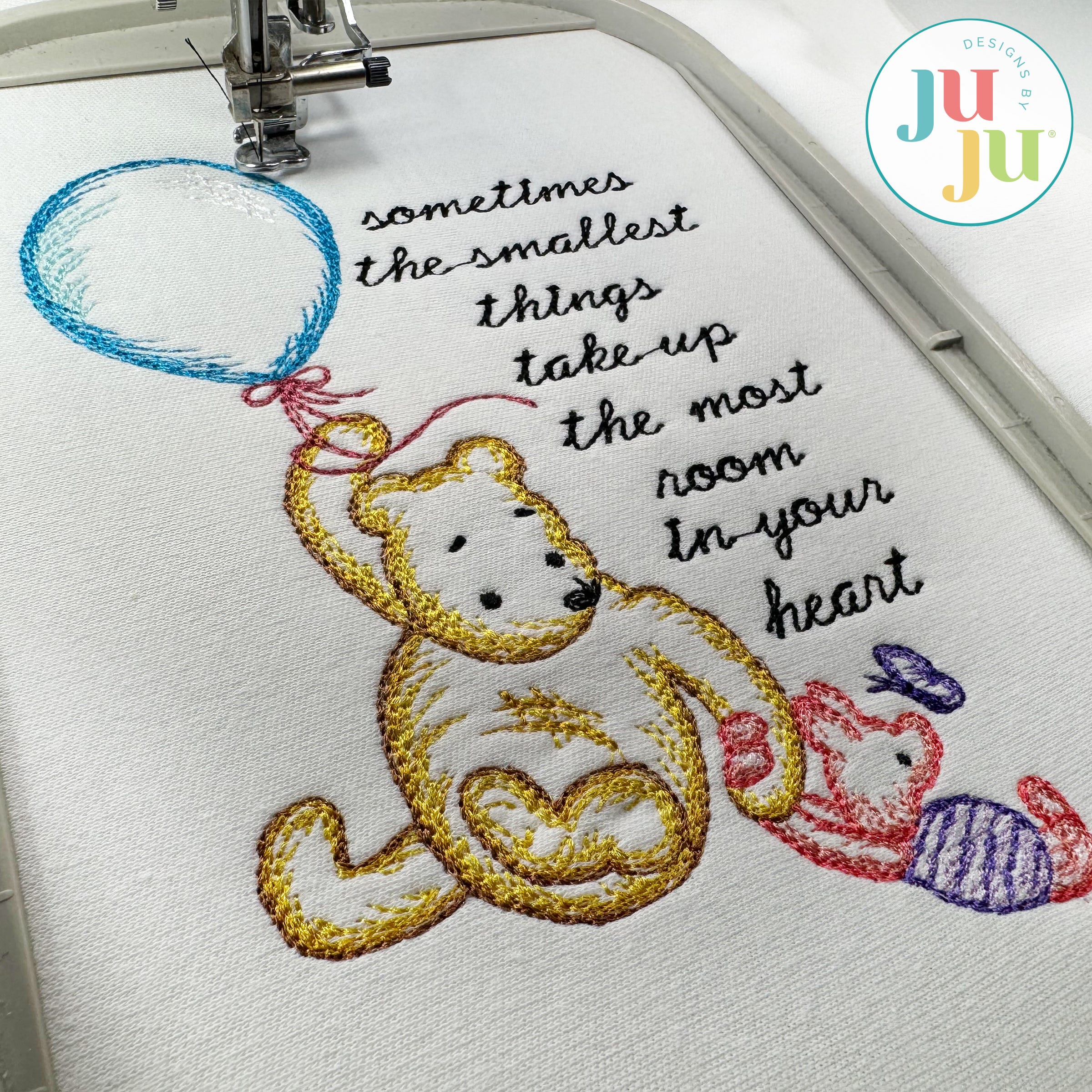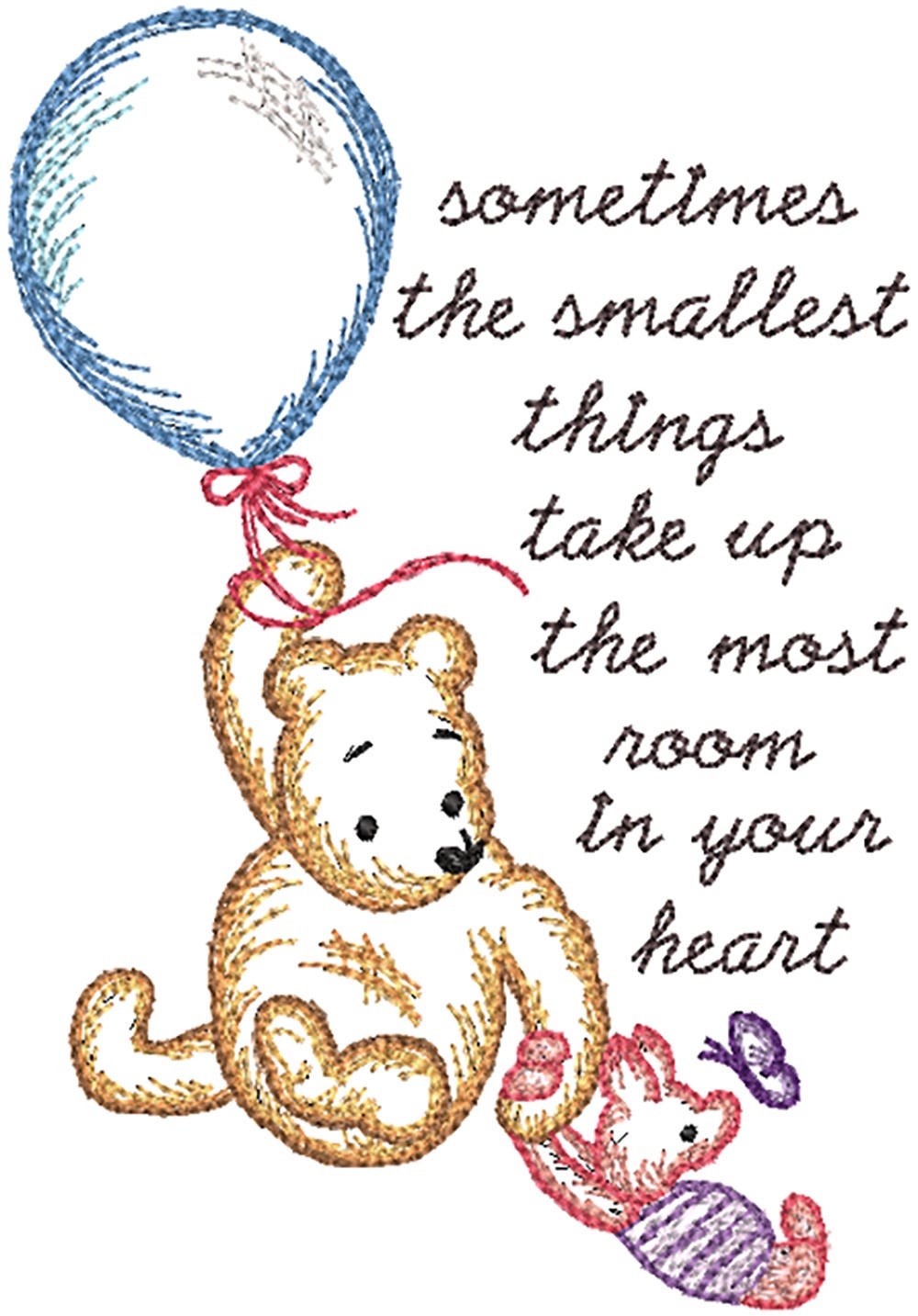 Pooh and Piglet are flying high with their sweet balloon and uplifting saying! This single embroidery-only design features strokes of bean stitches in multiple colors to mimic a soft watercolor effect. The lettering is done in a traditional bean stitch.