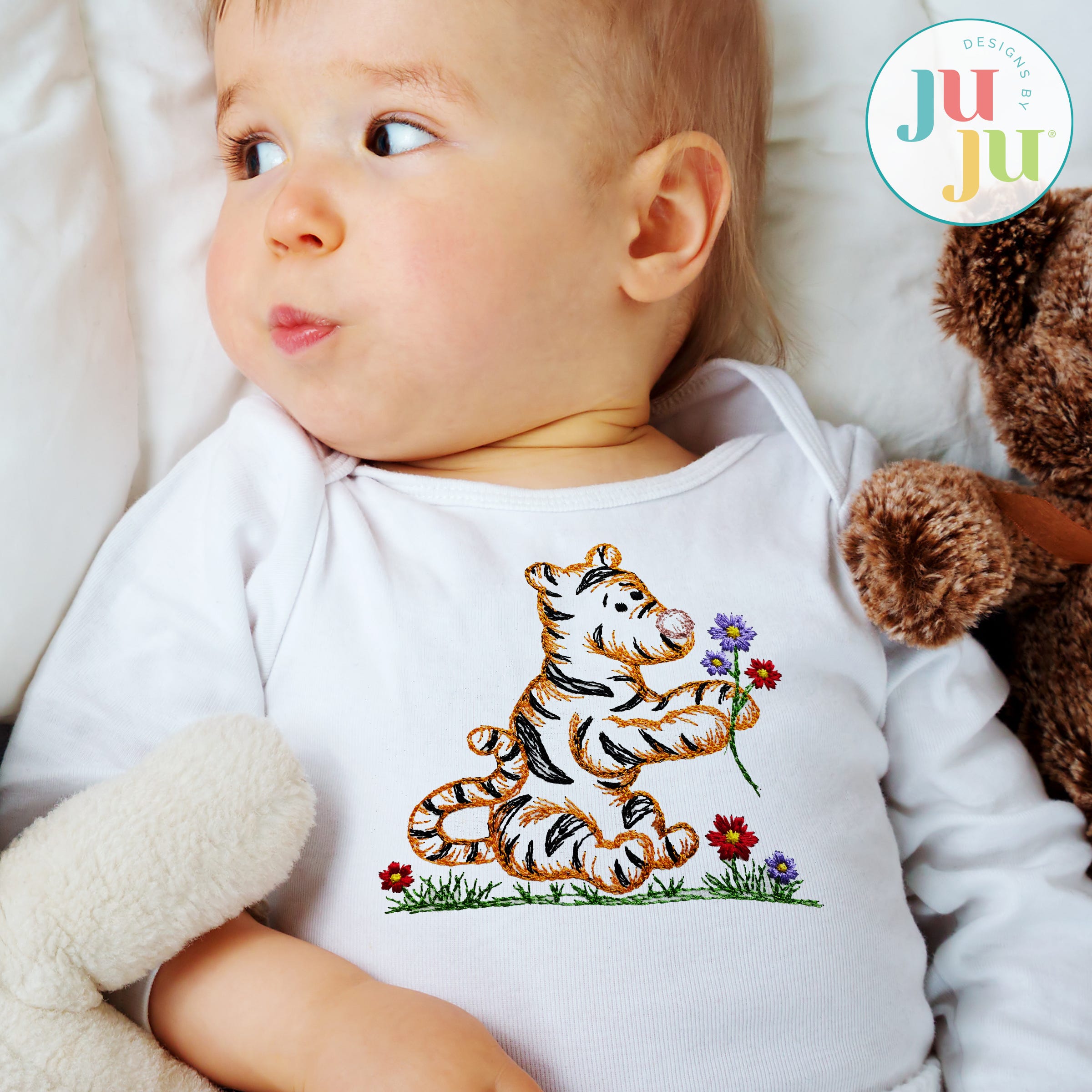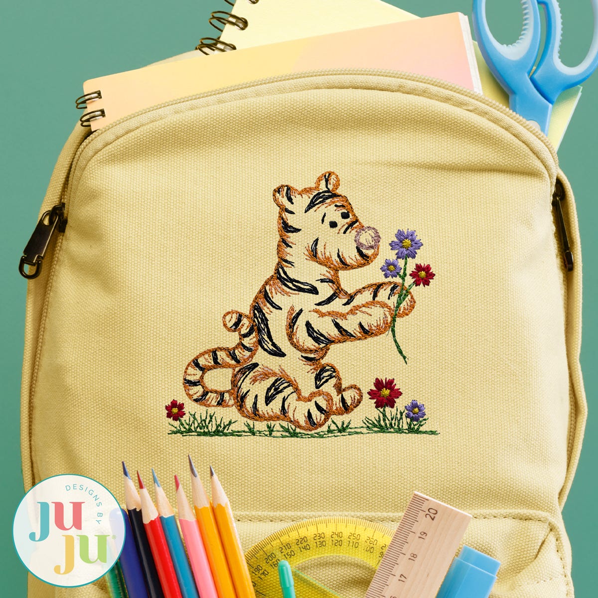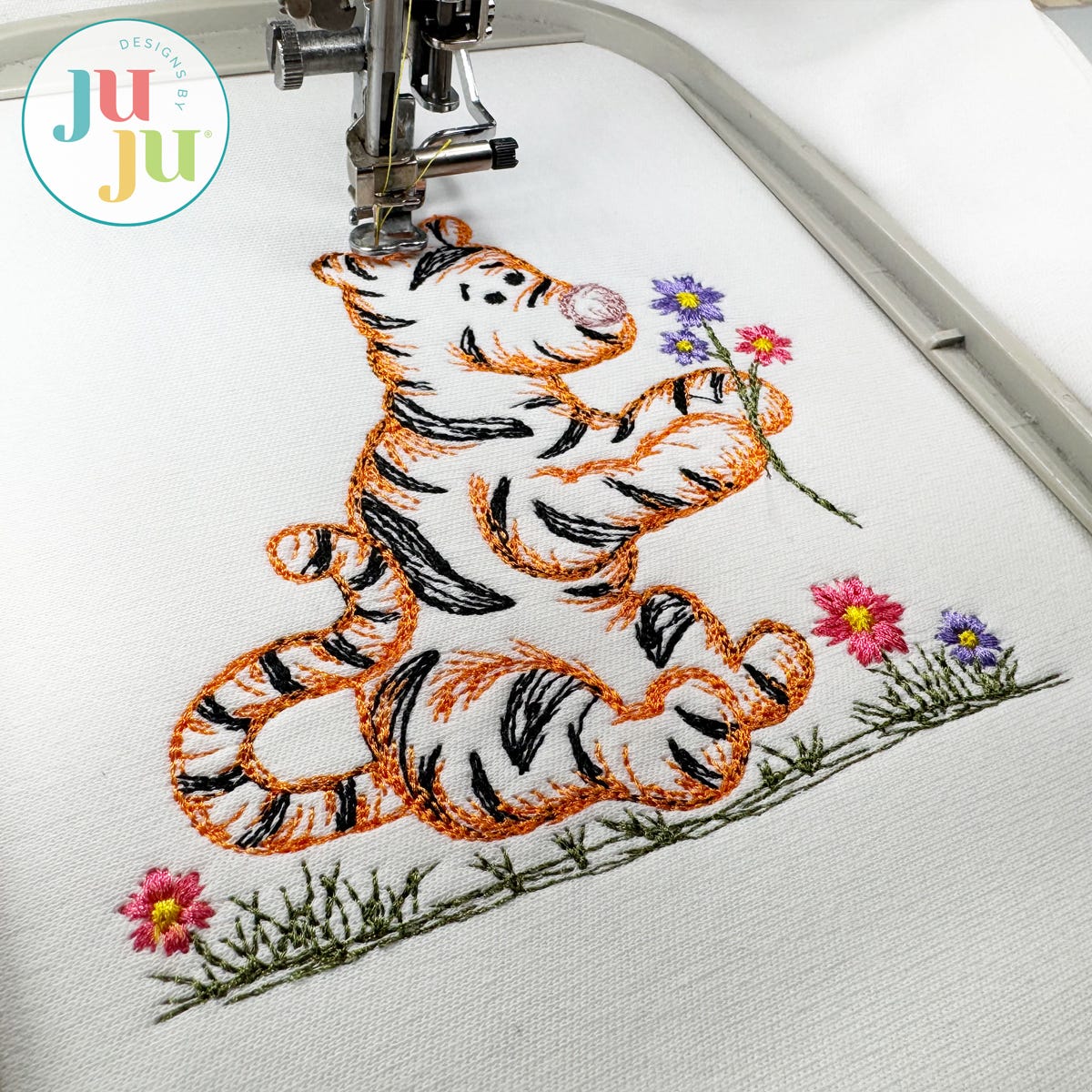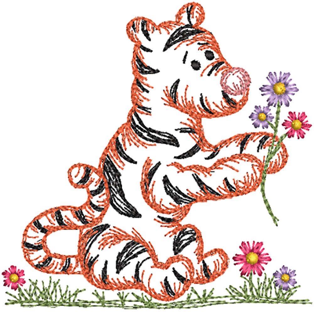 Tigger has bounced his way into a flower garden and has finally settled in for a sweet sniff! This single embroidery-only design features strokes of bean stitches in multiple colors to mimic a soft watercolor effect.