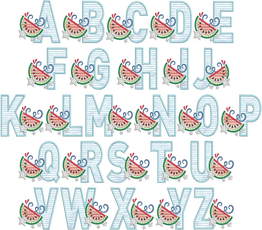 Our Watermelon Applique Alphabet features an applique watermelon wedge atop an applique letter. To maximize stitch efficiency, overlapped stitches have been removed, therefore the watermelon cannot be skipped.