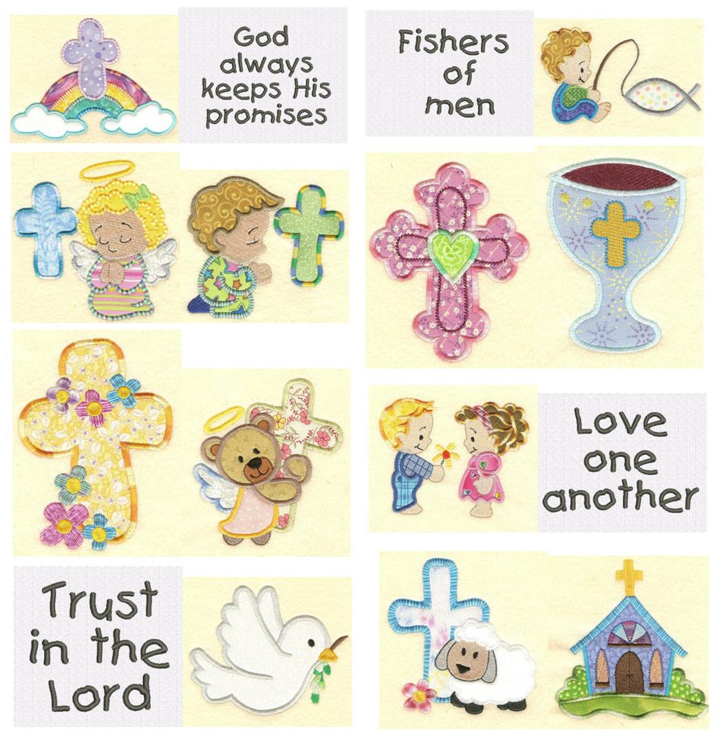 By popular request, this set consists of 12 precious Christian applique designs with 4 sayings. These designs are perfect for baby/toddler/child items including new baby gifts, blankets or quilts, baptisms, a child's first communion and more. They are not just for the wee little child either!