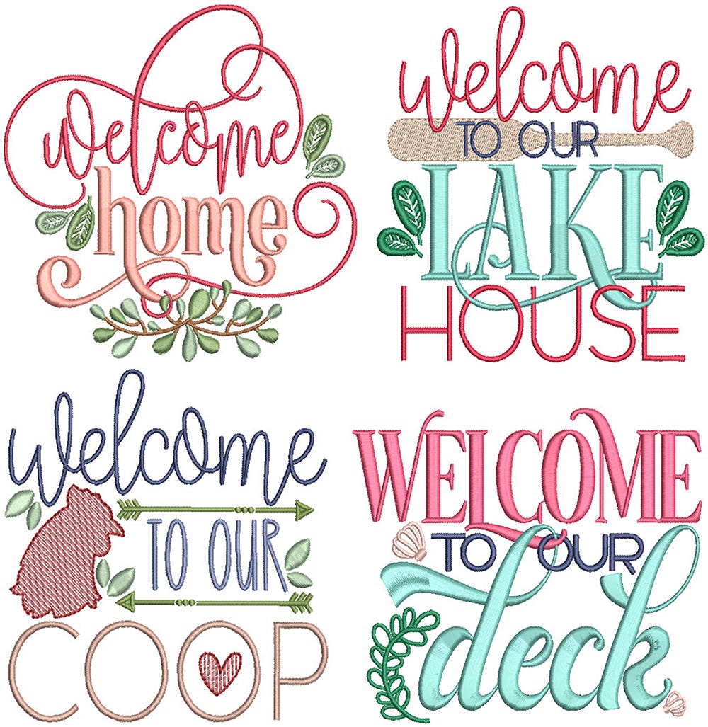 4 more sweet welcome sign designs! These text designs are primarily satin stitch embroidery with some sketch and fill stitch objects.