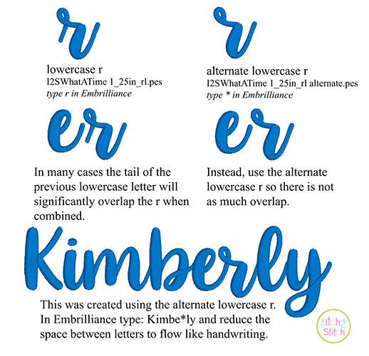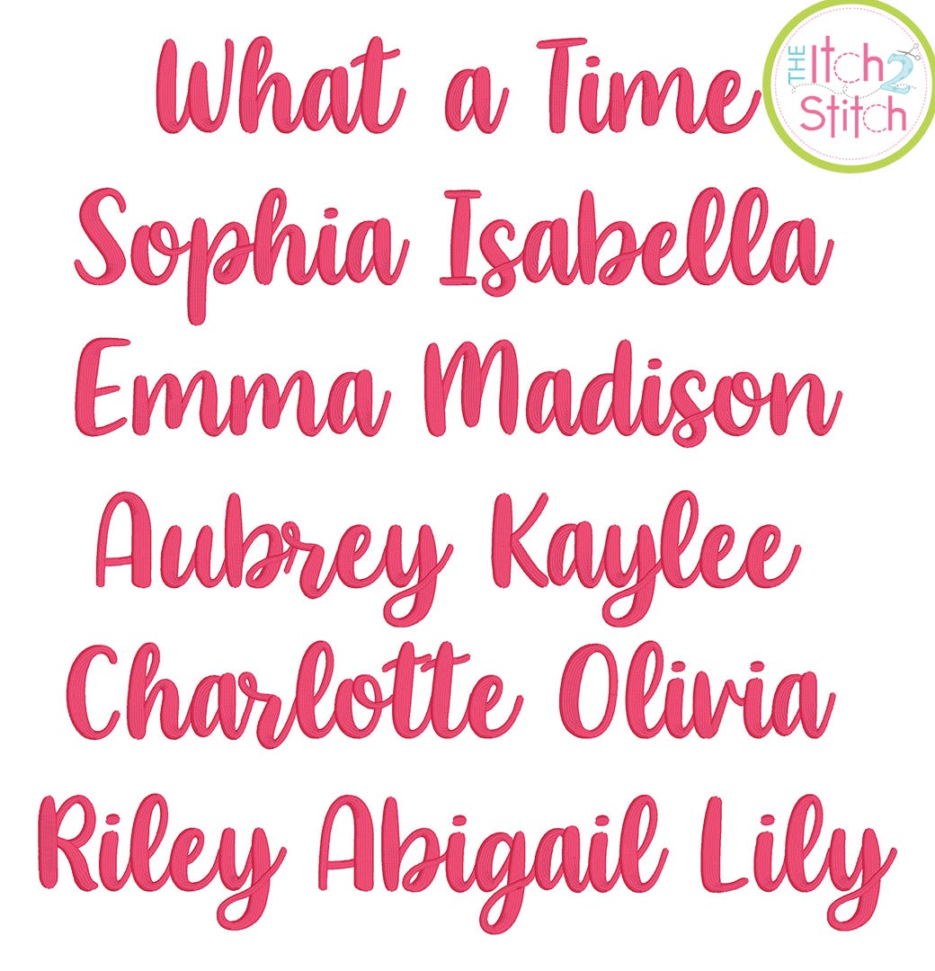 You will receive Aa-Zz letters, numbers, punctuation and alternate lowercase r (80 files) in six sizes (0.5", 0.75", 1", 1.25", 1.5", and 1.75"). The font sizes are based on the height of the capital A, then scaled appropriately in keeping with the original artwork. All individual letters/numbers fit in a 4x4 hoop.
