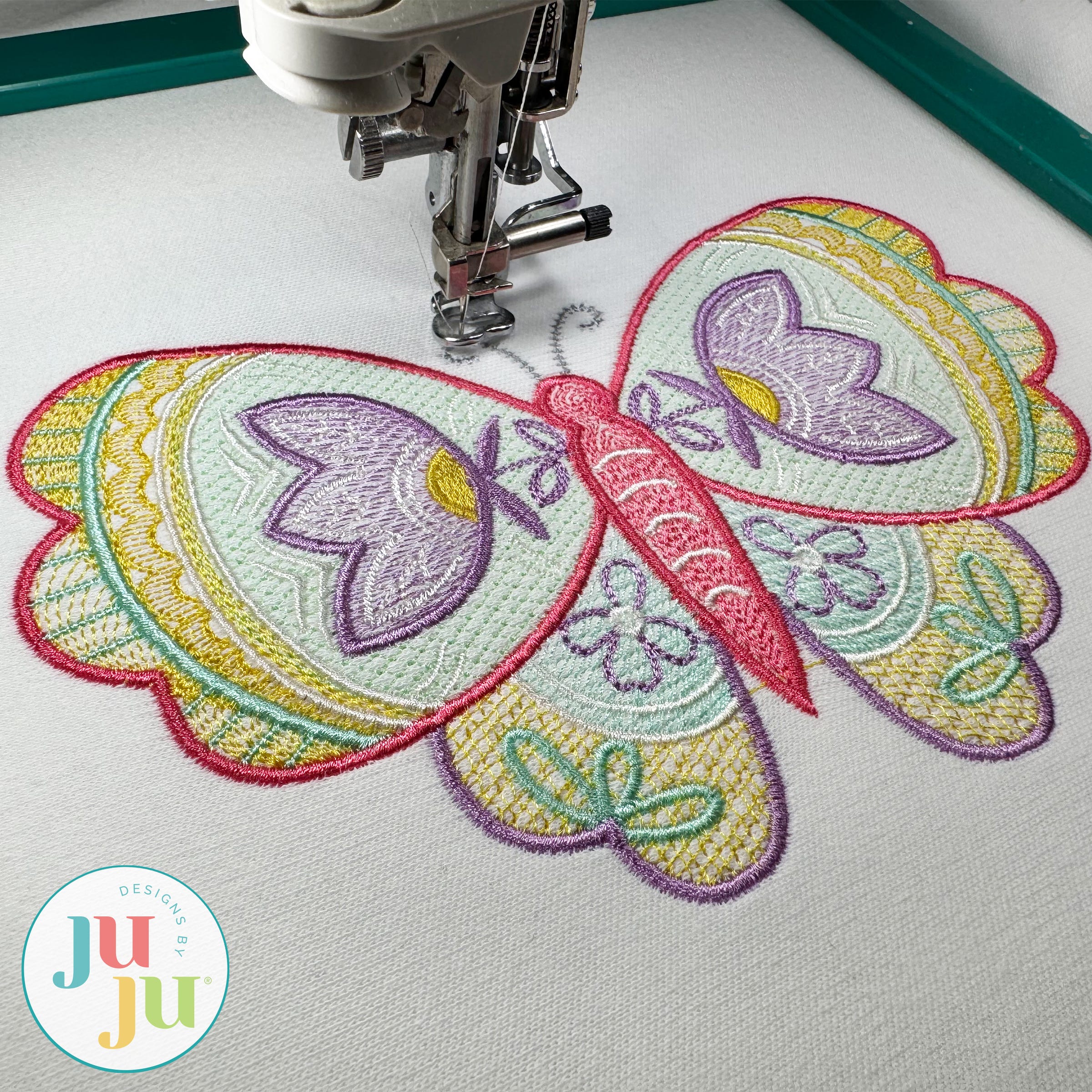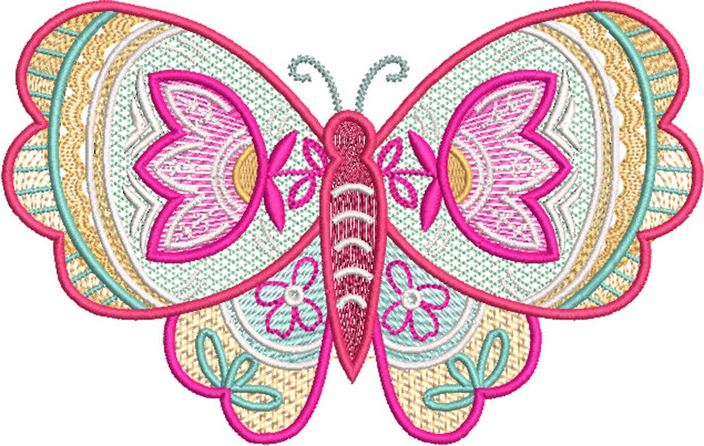 Let your FANCY take flight! This single embroidery-only fancy floral butterfly design features a beautiful blend of sketch and motif fills with satin stitch outlines and details.