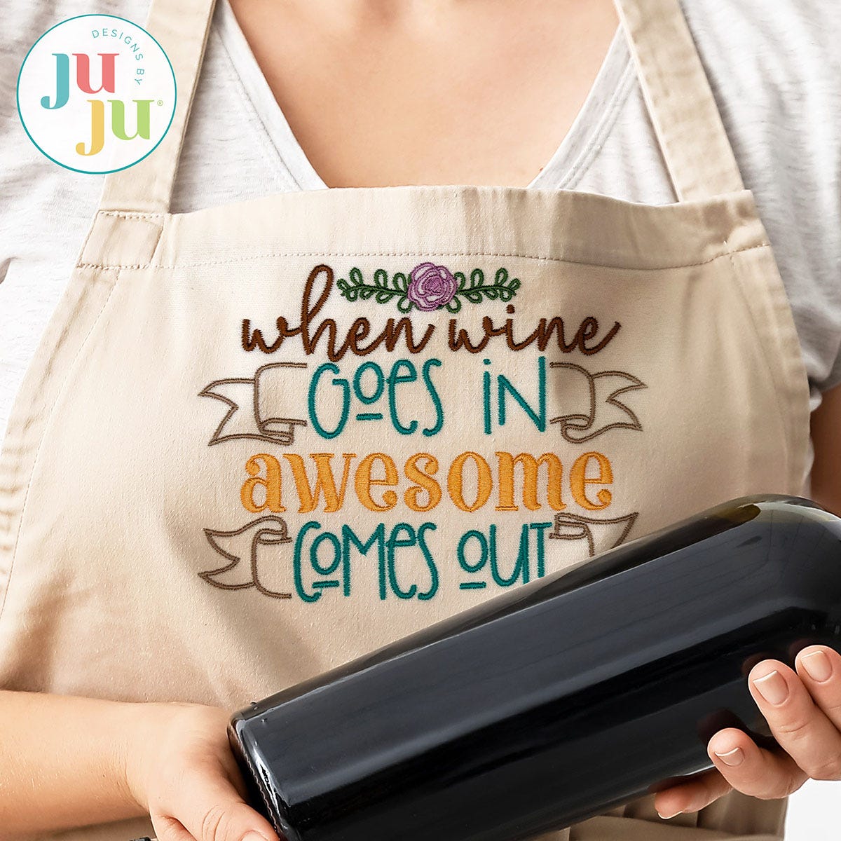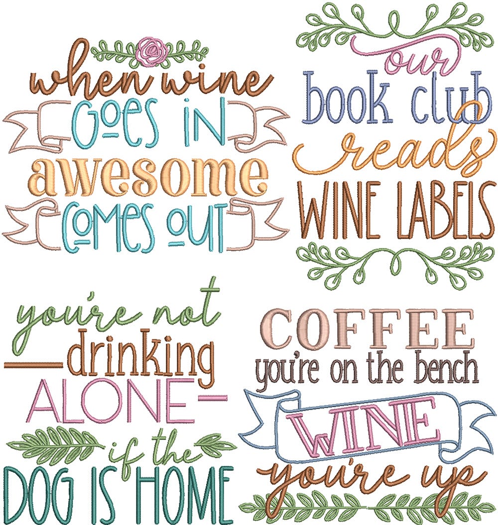 Four more witty wine themed word art designs! These embroidery-only designs feature satin stitch lettering and design details