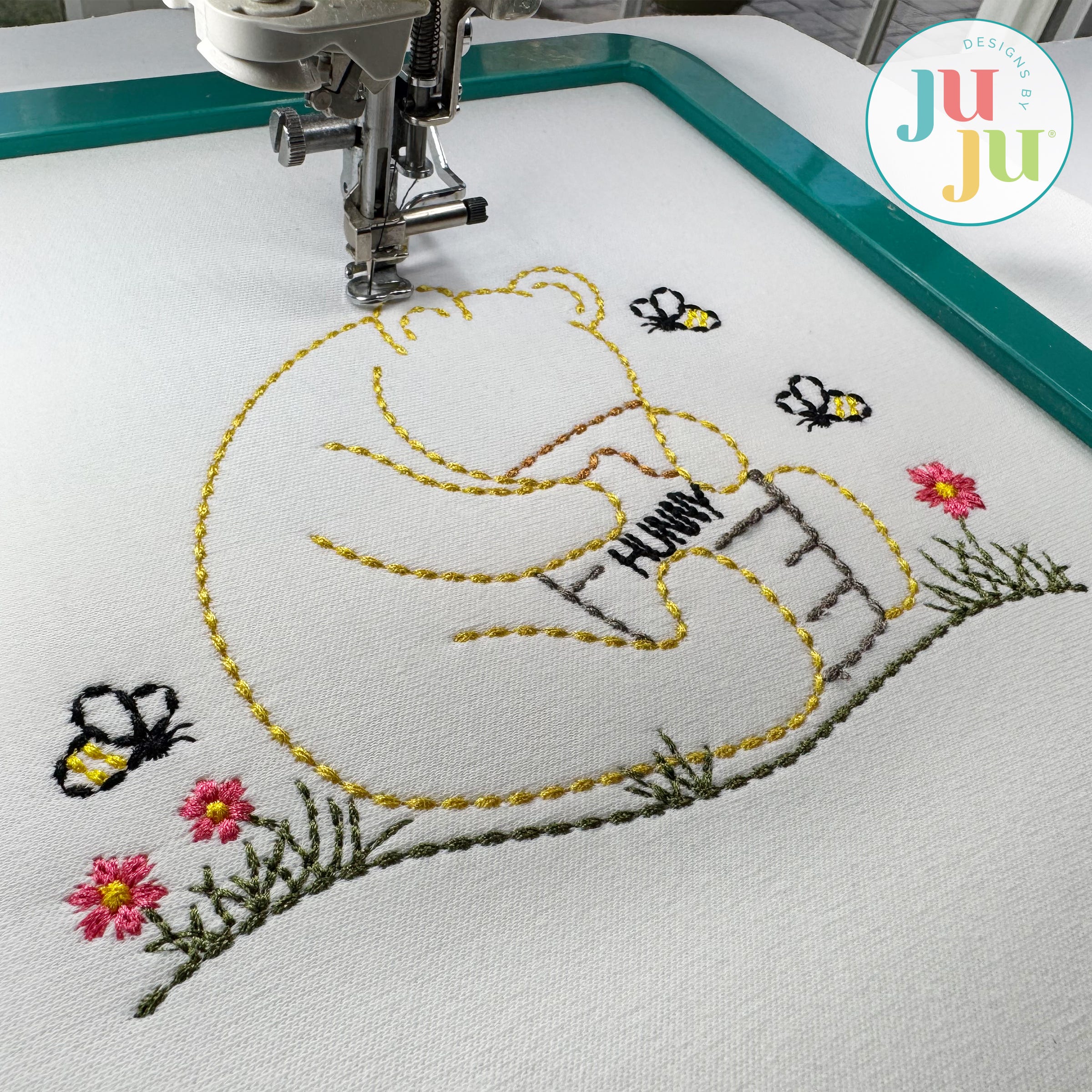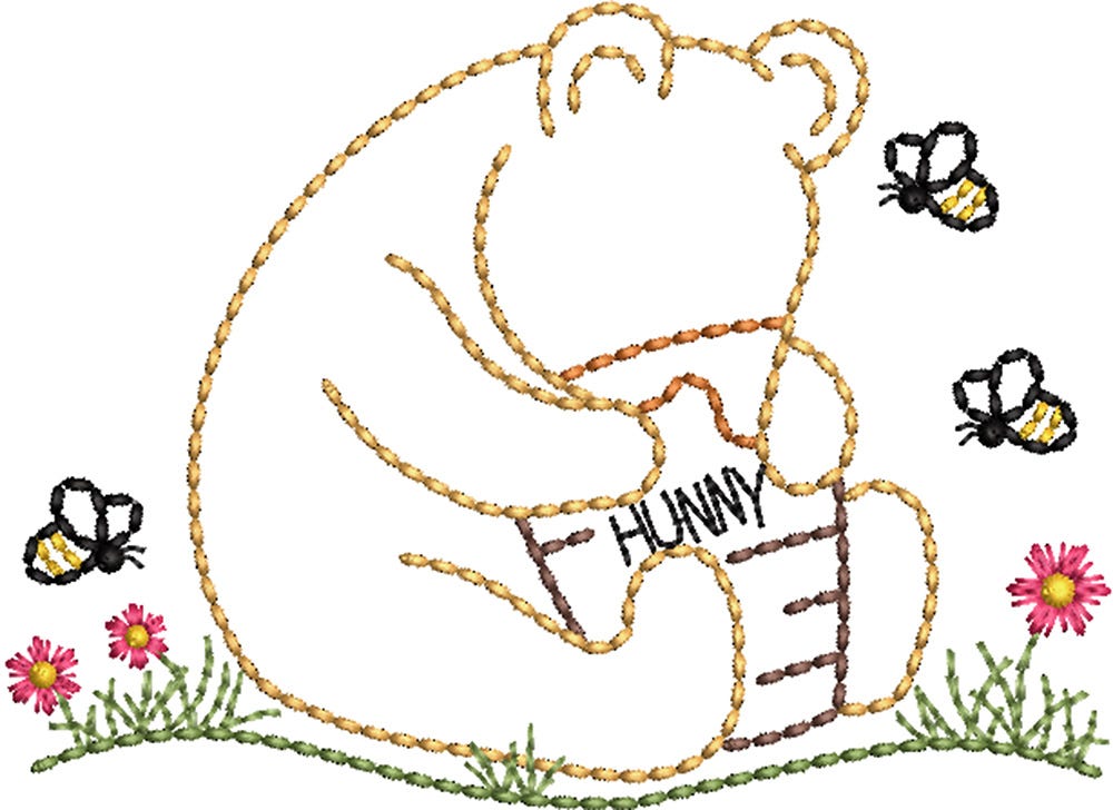 Our embroidery-only design of Pooh with his head in a Hunny Pot is perfect for vintage baby projects. This single design features a heavy bean stitch (seed stitch) for a hand-stitched look.