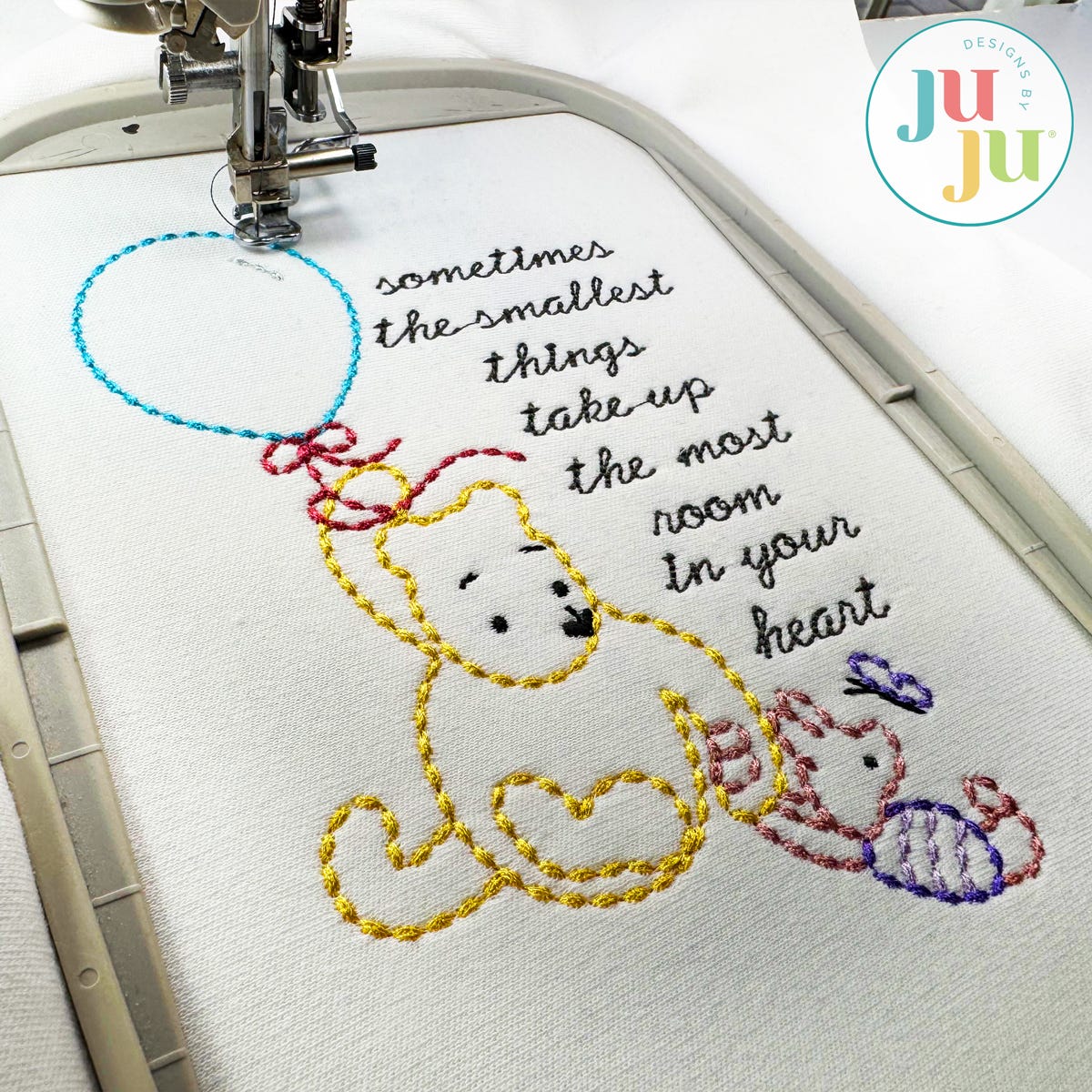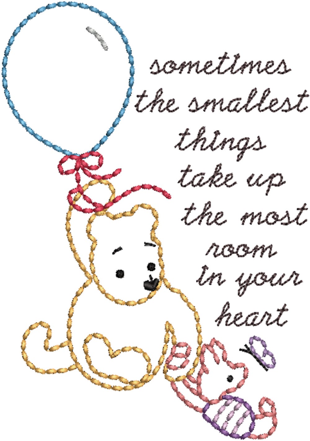 Pooh and Piglet make the perfect pair along with their sweet balloon and precious saying! This single embroidery-only design features a heavy bean stitch (seed stitch) for a hand-stitched look. The lettering is done in a traditional bean stitch.