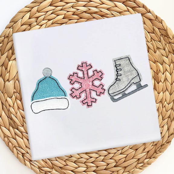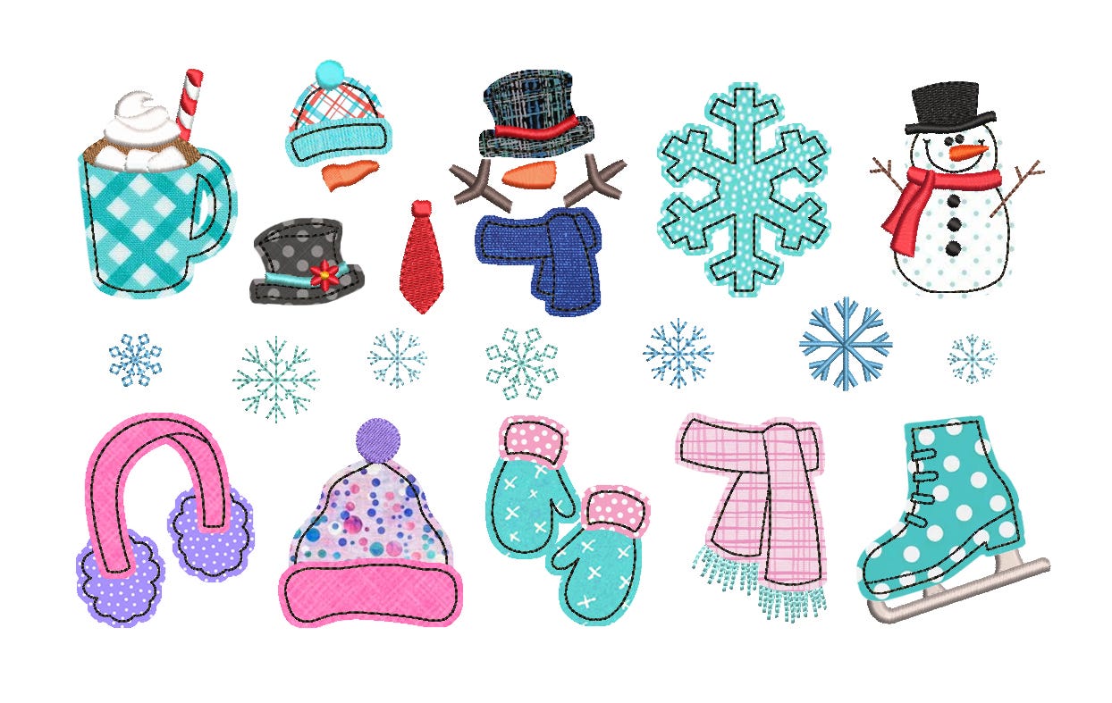 Winter Kit includes twelve appliques (Ear Muffs, Hat, Hot Cocoa, Ice Skate, Mittens, Scarf, Snowflake, Snowman,