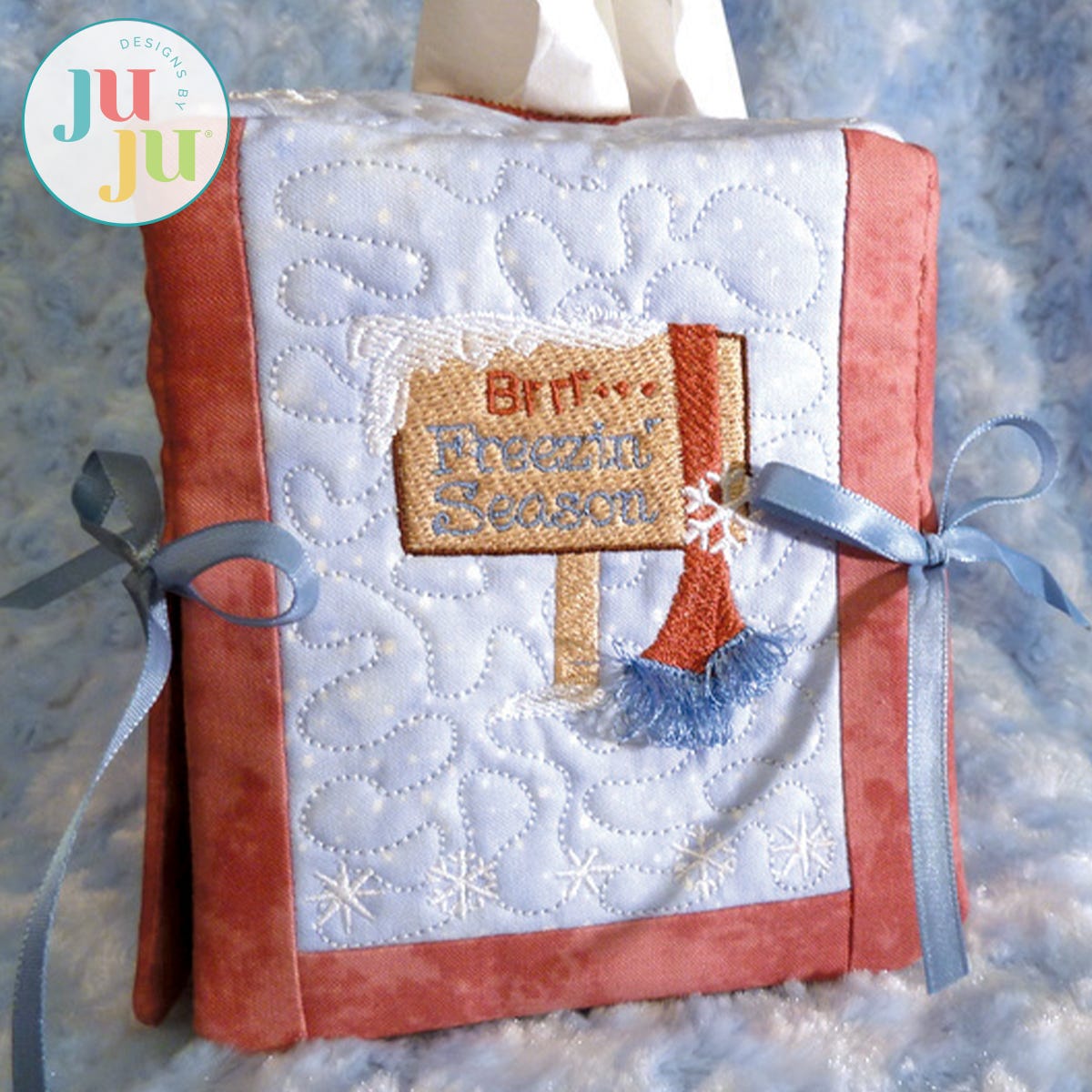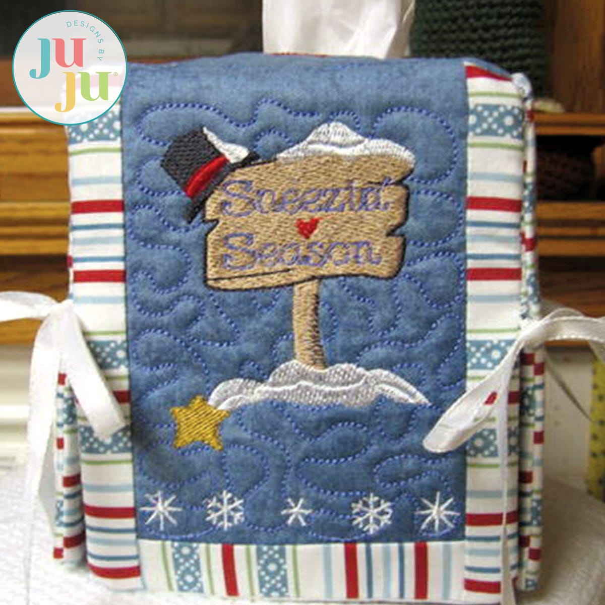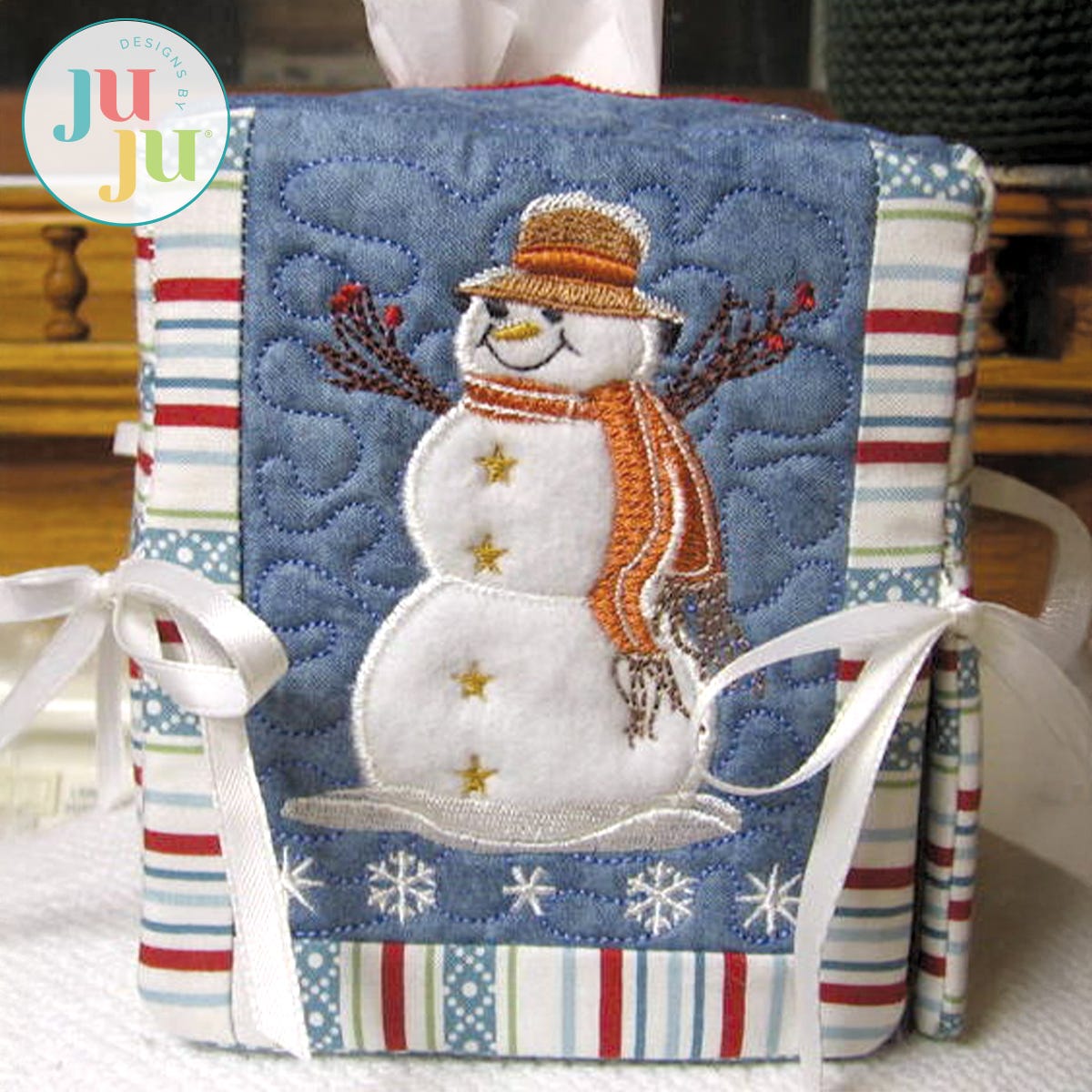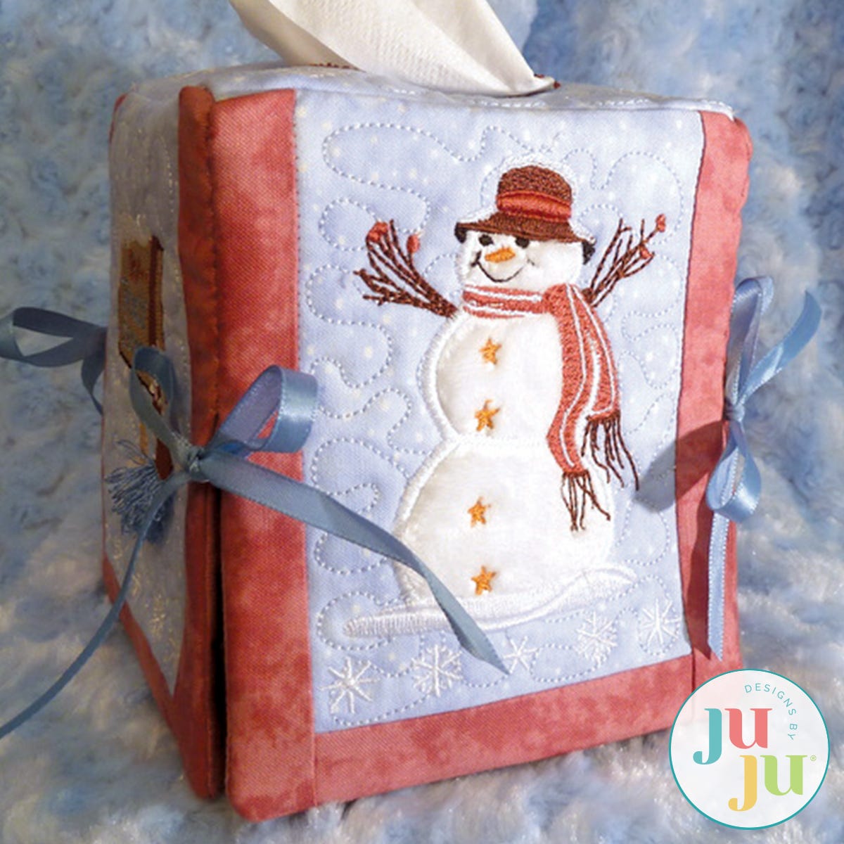 This seasonal tissue box cover will add a touch of whimsy to your winter decorating. Each side and top is stipple quilted, lined, and pieced together in the hoop. Satin ribbons tied at the sides further enhance the whimsical feel. There are two sides with snowmen, two sides with designs One says Brr Freezin Season and another that says Sneezin Season.
