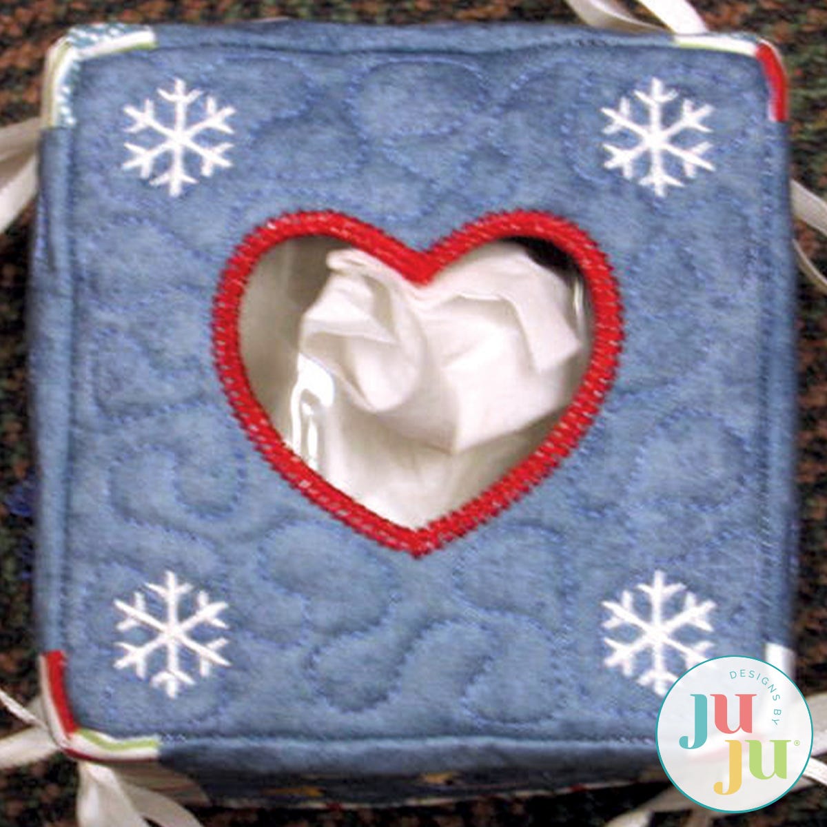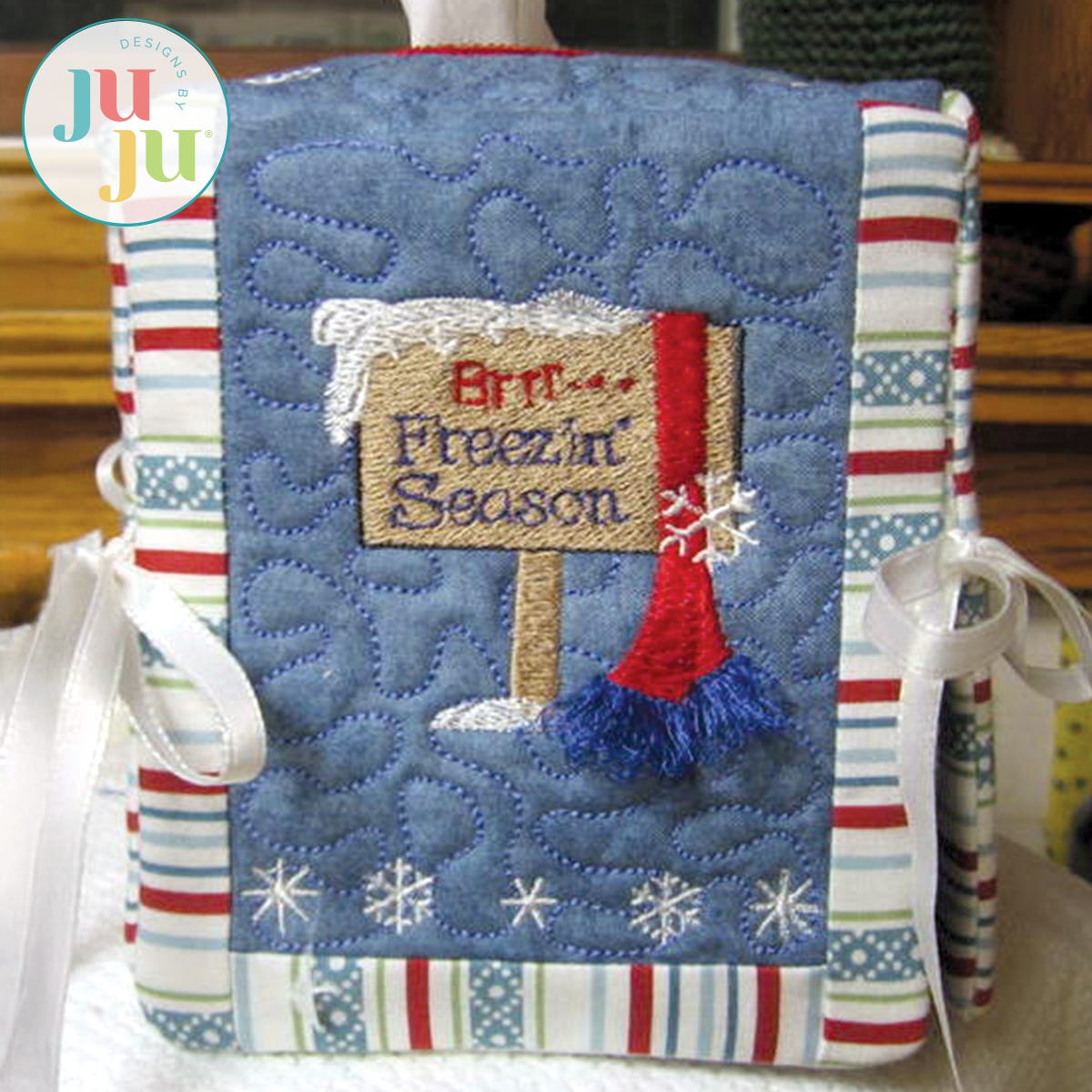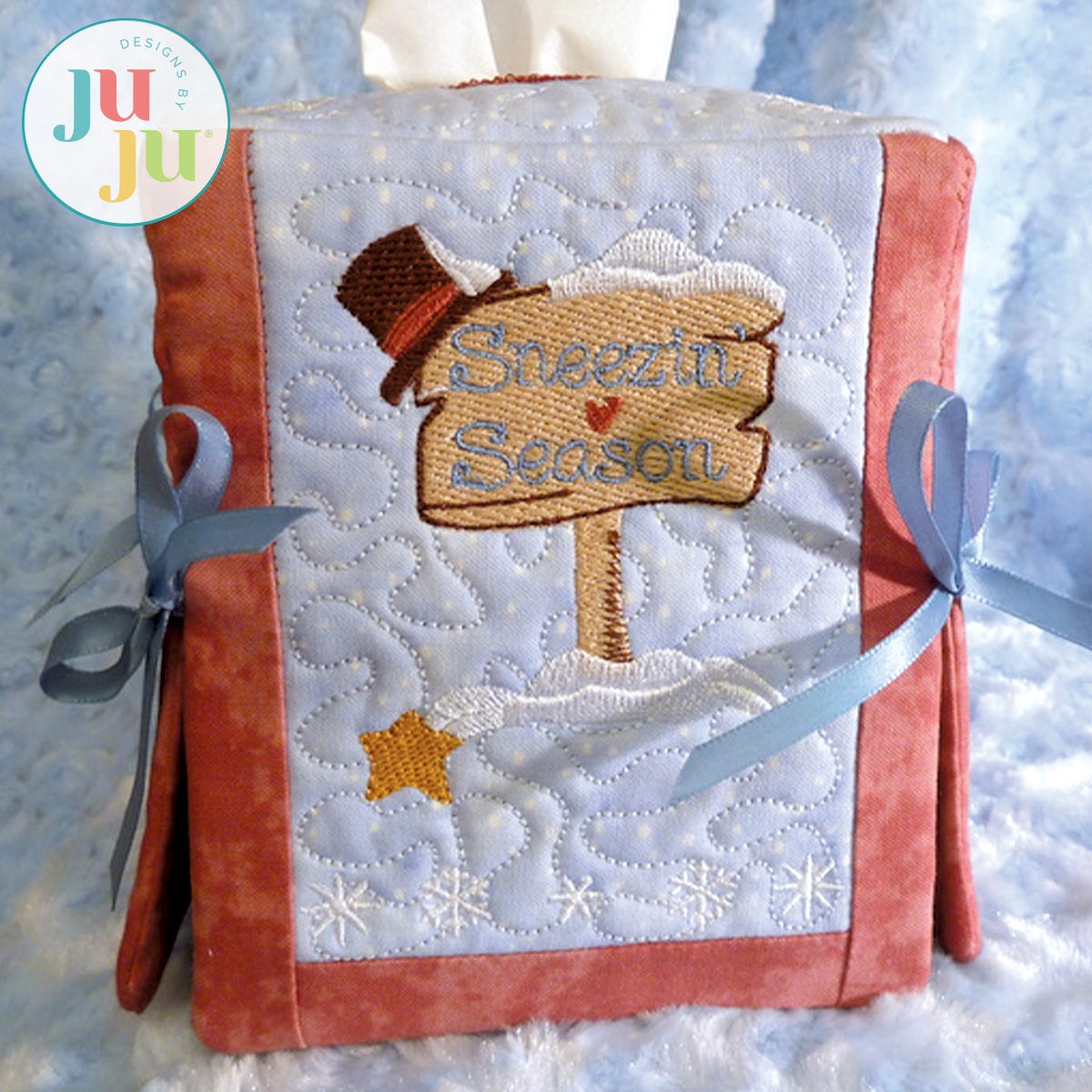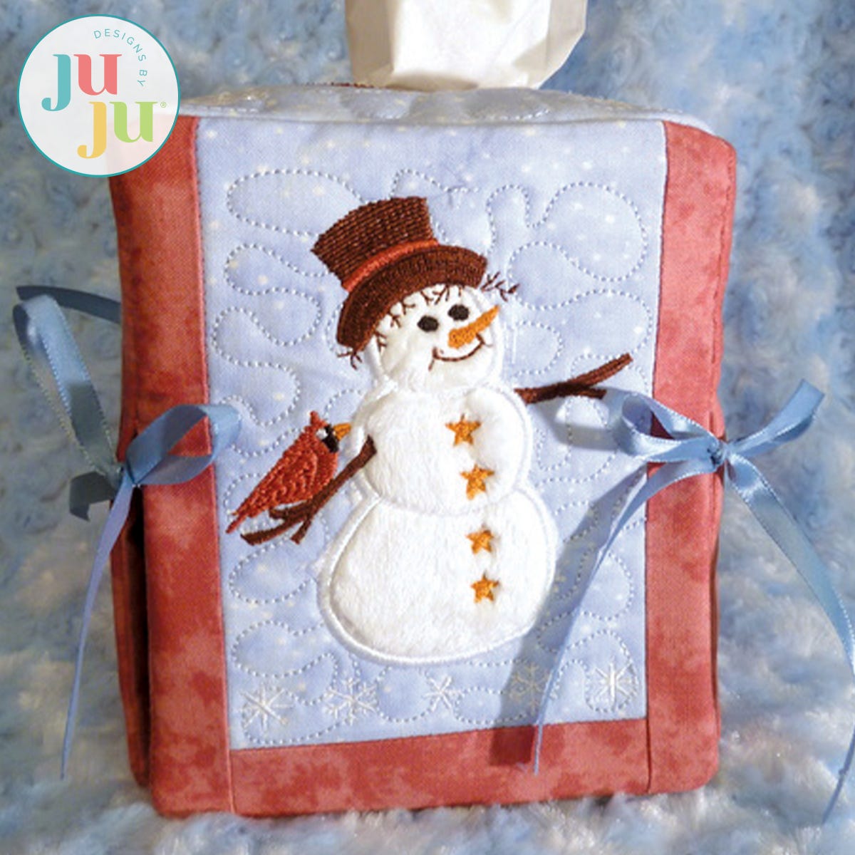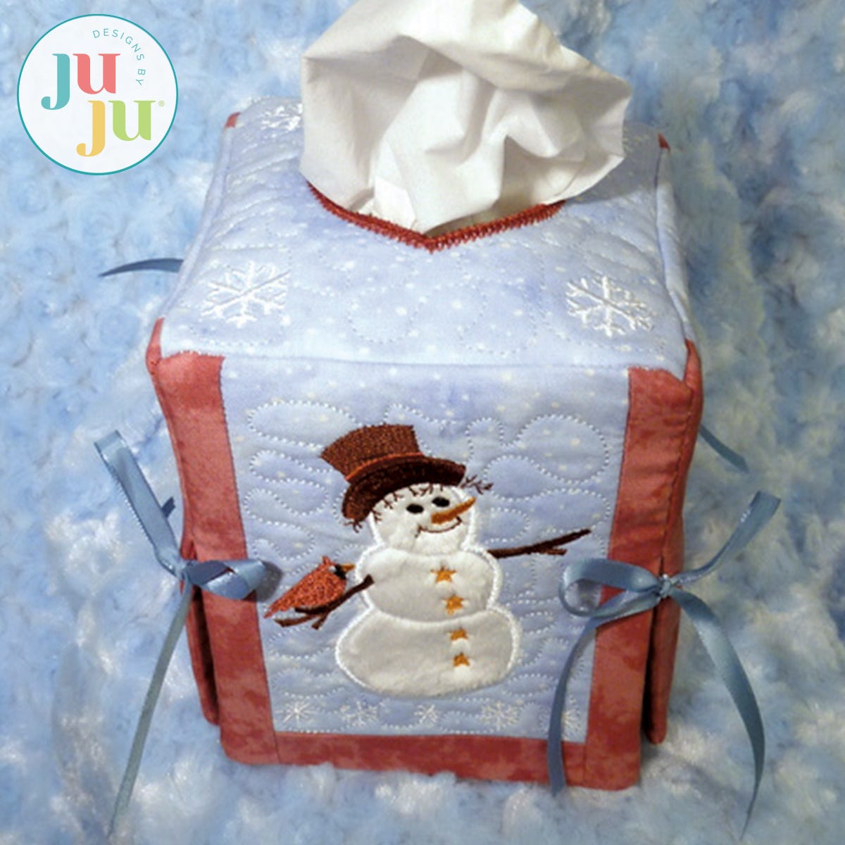 This seasonal tissue box cover will add a touch of whimsy to your winter decorating. Each side and top is stipple quilted, lined, and pieced together in the hoop. Satin ribbons tied at the sides further enhance the whimsical feel. There are two sides with snowmen, two sides with designs One says Brr Freezin Season and another that says Sneezin Season.