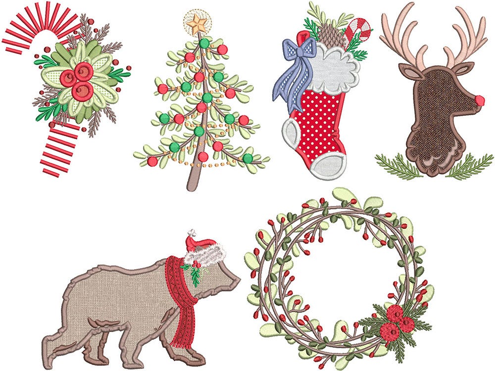 6 beautiful and festive Christmas designs! The tree and wreath are embroidery only; the other four designs feature applique elements.
