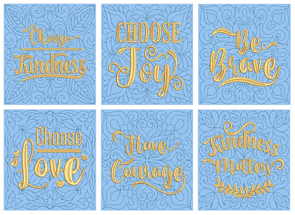 6 beautiful and inspirational quilt block designs!Ā These quilt blocks feature a double pass of running stitches for the quiltingĀ background and split satin stitch lettering. Please note: the pathing of the quilting lines includes running stitches under the text, therefore the text cannot be skipped.Ā