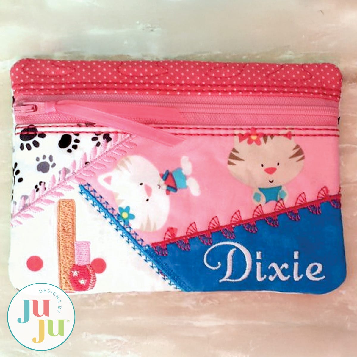 This little zippered pouch is a lot of fun to make. The zipper is applied in the hoop and if you have never done this before, you will be surprised at just how easy it is do so. The pouch is stipple quilted in the back. The inside is lined and hides all seams. There is a pocket on the back.
