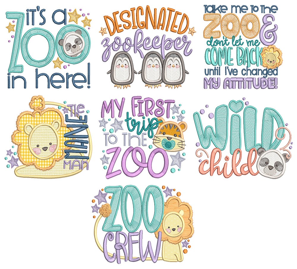 *Please note that the following designs contain applique components:Ā It's a zoo in here / Designated zookeeper / The mane man / My first trip to the zoo / Wild child / Zoo Crew /Ā